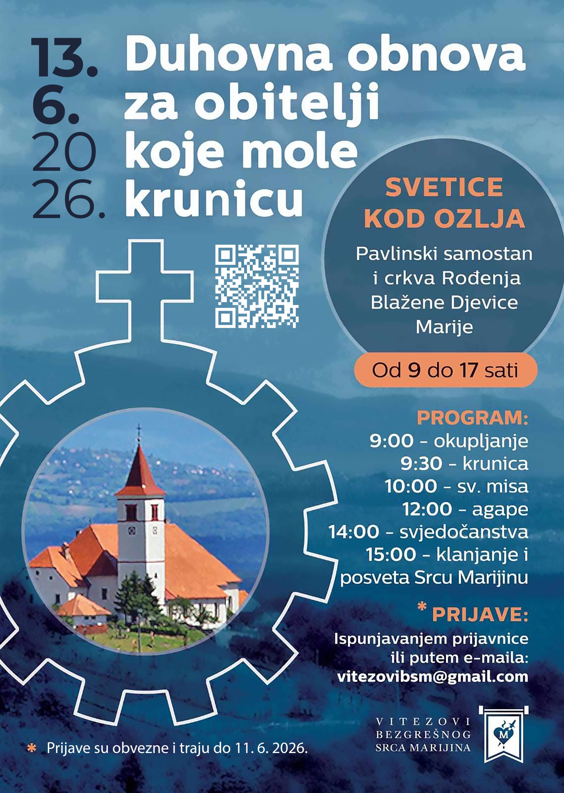 U subotu, 13. lipnja 2026., u pavlinskoj crkvi Rođenja BDM u Sveticama kod Ozlja održat će se duhovna obnova za obitelji koji mole krunicu u organizaciji bratstva Vitezovi Bezgrešnog Srca Marijina.