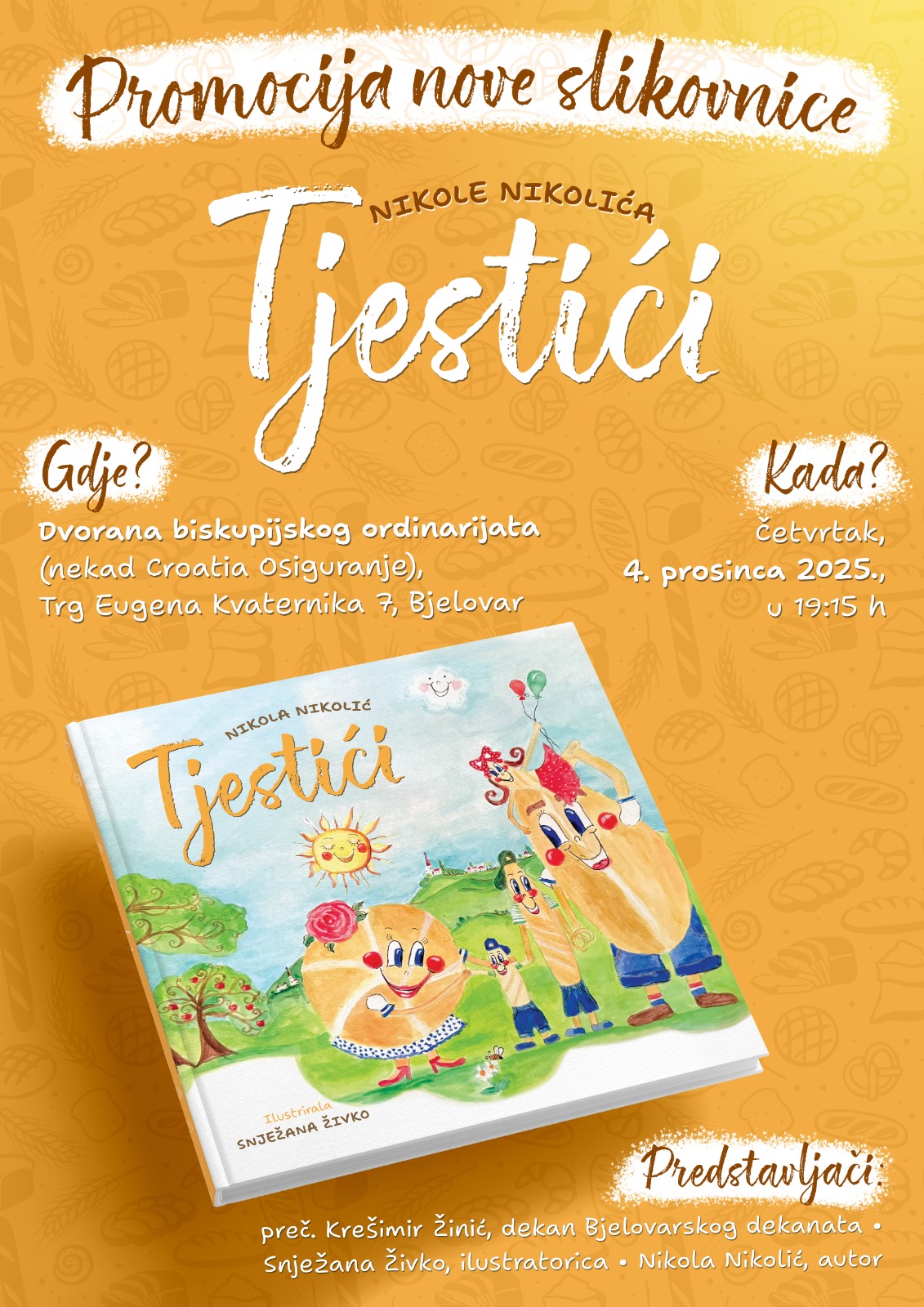 Ovog četvrtka, 4. prosinca, u 19.15 h održat će se promocija slikovnice „Tjestići” bjelovarskog pisca za djecu Nikole Nikolića, a u izdanju Naklade Crisinus.