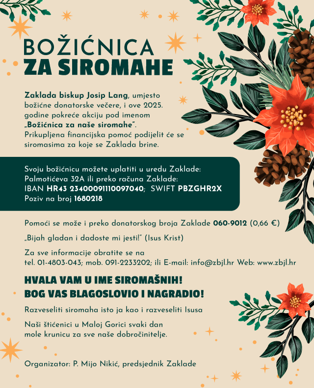 Zaklada biskup Josip Lang, umjesto božićne donatorske večere, i ove 2025. godine pokreće akciju pod nazivom „Božićnica za naše siromahe“.