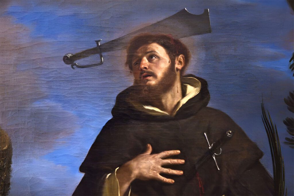 Kao žrtva heretičke zavjere uhvaćen je na Bijelu nedjelju, 6. travnja 1252, u šumi kod Sevesa (Lombardija), kad se vraćao iz Coma u Milano. Udarili su ga kosirom u glavu, a potom mu nožem proboli srce. Dok su ga zlotvori mučili, molio je Vjerovanje i ponavljao: „Gospodine, u ruke tvoje predajem duh svoj“. Svojim krvavim prstom napisao je na tlu: „Credo“ („Vjerujem“). Tada je umoren i njegov pratitelj i subrat Domenico.